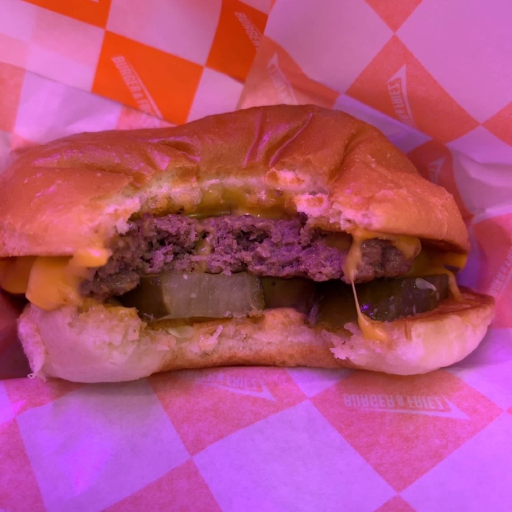 햄버거가 나왔습니다. 햄버거 용기 높이가 딱 먹기 좋은 높이예요. 햄버거 안에 내용물이 흐르지 않으면서도 봉지를 뒤로 젖혀야 먹는 번거로움 없이 바로 먹을 수 있게 한 아이디어 좋더라고요. 맛은,, 일단 식감이 너무 부드러워서 깜짝 놀랐습니다. 부드러움이 거의 마시멜로급. 햄버거가 이렇게 쫀득할 수 있구나 싶었습니다. 수제버거라 맛은 당연히 있었고요. 미국 체다치즈를 썼다는데 저는 입맛이 둔해서 그런지 잘 모르겠더군요.