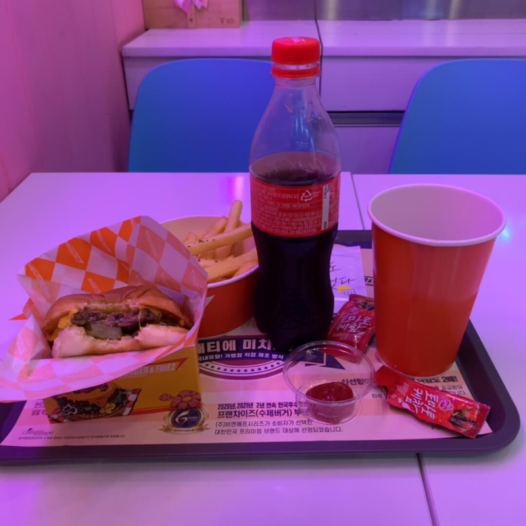 서울, 경기권에 주로 있고 지방에는 대구랑 충북 음성, 강원 오크밸리(원주), 강원 춘천, 대전 유성구, 충남 계룡시, 대전 서구, 전주, 정읍, 대구 등에 있네요. 오리지널 싱글버거 세트로 시켰고요. 콜라를 기성품으로 주는 게 좀 특이했습니다.