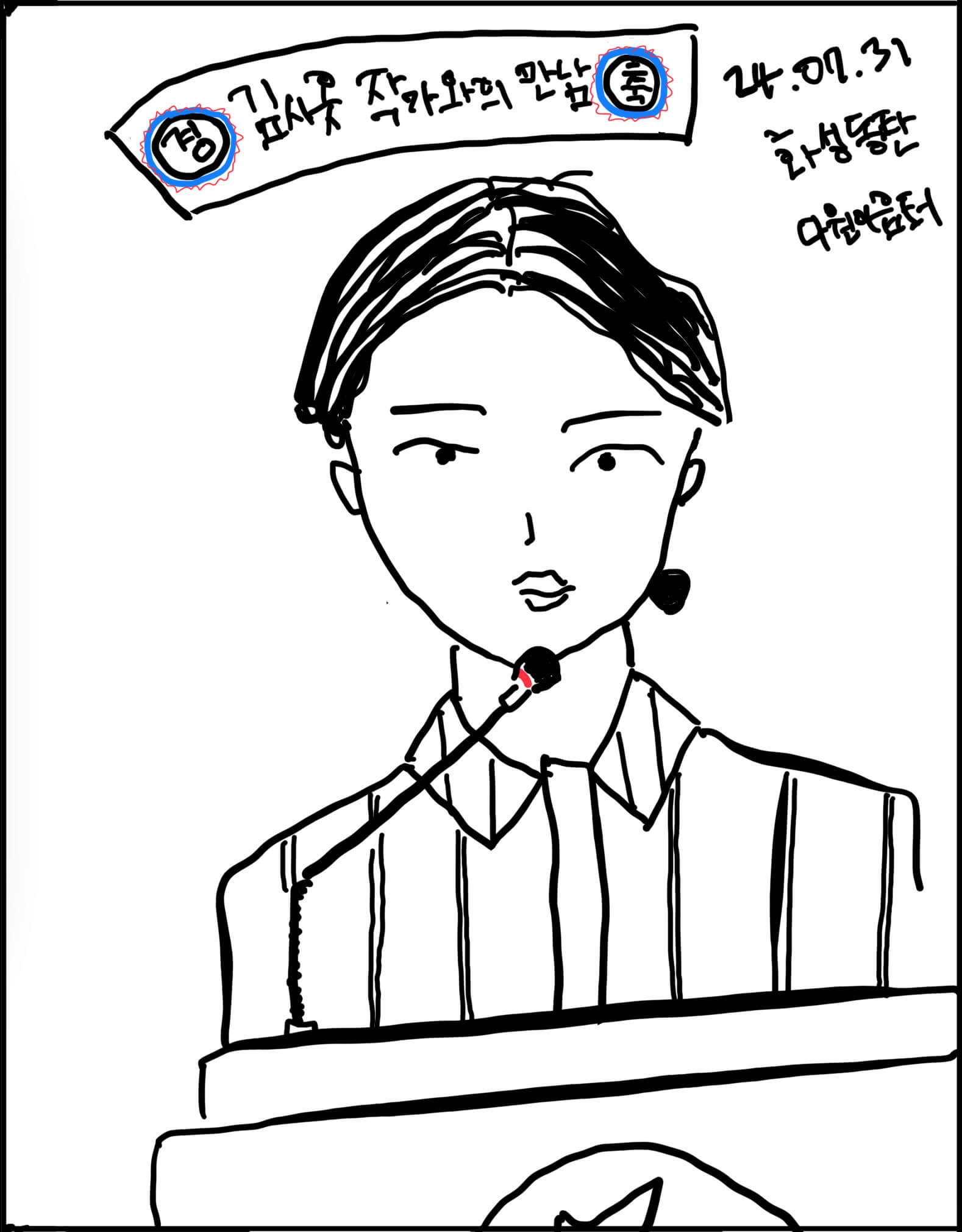 이건 강의하시는 김시옷 작가님을 제가 아이패드로 그려본건데요. 2시간 정도의 개인의 이야기부터 '소심백서' 책 이후의 이야기들, 그리고 내향인들에게 하고 싶은 이야기나 조언들을 곁들인 시간이었습니다. 사람들 앞에서도 버벅되지 않고 2시간 동안 조곤조곤 말씀을 잘하시더라고요. 이분이 내향인 분이 맞나 싶을 정도로 아주 매끈하면서도 알차게 내용을 잘 말해주셨습니다. 1달 동안 잠도 잘 못 자면서 준비하셨다는데 정말 그러셨을 거 같은 생각에 감사한 마음이 들었습니다.