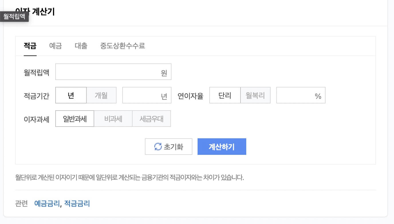 네이버에서 <이자 계산기>라고 검색하고 저축금액과 기간 이율등을 입력하면 내가 받는 총 이자가 얼마인지 알 수 있습니다.