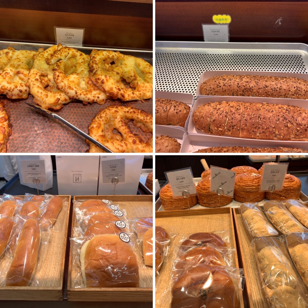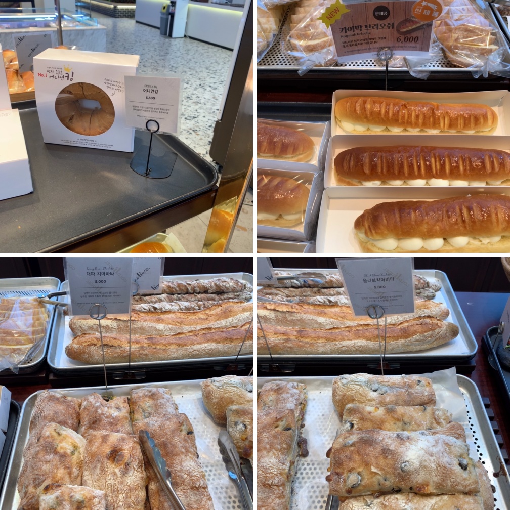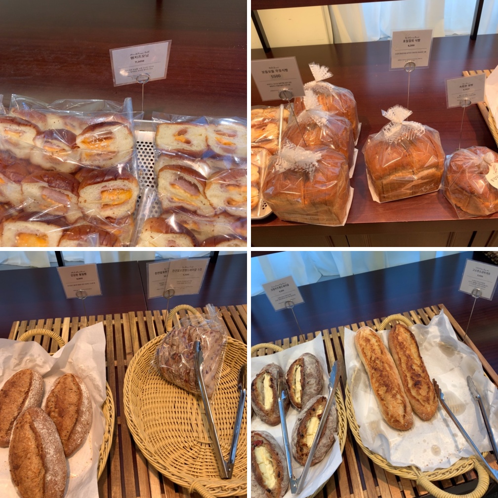바게트 경우 바게트를 썰어주는 직원분이 따로 계십니다. 친절하게 응대해 주십니다. 가격이 꽤 세죠. 가장 저렴한 슈크림빵이나 단팥빵이 2,500원입니다. 그외에 빵들은 5~9천 원 내외가 제일 많습니다.